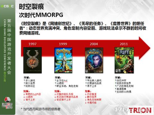 在2012年度的CGDC(中国游戏开发者大会)上,《时空裂痕》以新一代MMO领军人物自居,一针见血地指出了《魔兽世界》的短板——内容重复、世界静态、角色定制有限以及卡通风格。