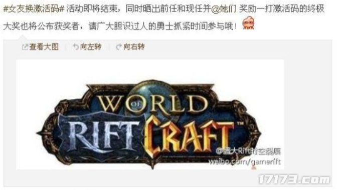 其次,这个LOGO出现的地方,是在《时空裂痕》官方所举办的一个名为“女友换激活码”活动页面上。规则很简单:只要同时晒出“前任”和“现任”的合照,并@她们,就能赢取测试资格。