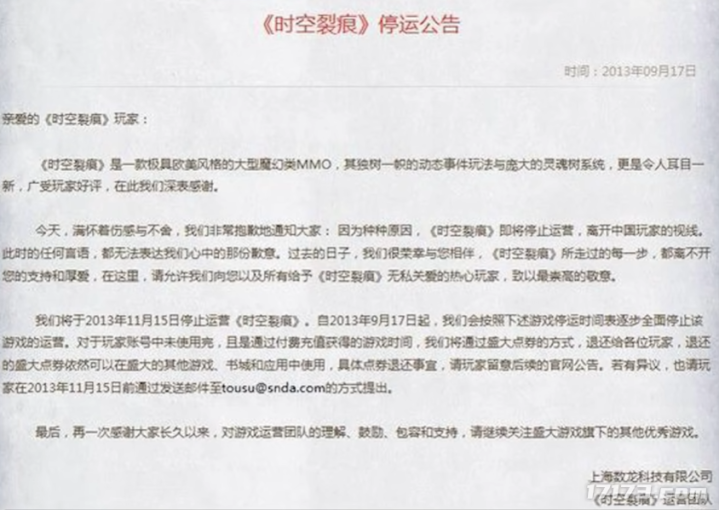 而这,也正是盛大为何没有全力挽救《时空裂痕》,而是选择直接“滑轨关服”的关键原因。