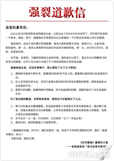 紧接着,《时空裂痕》又发布了另一封名为《强裂道歉信》的公开声明。